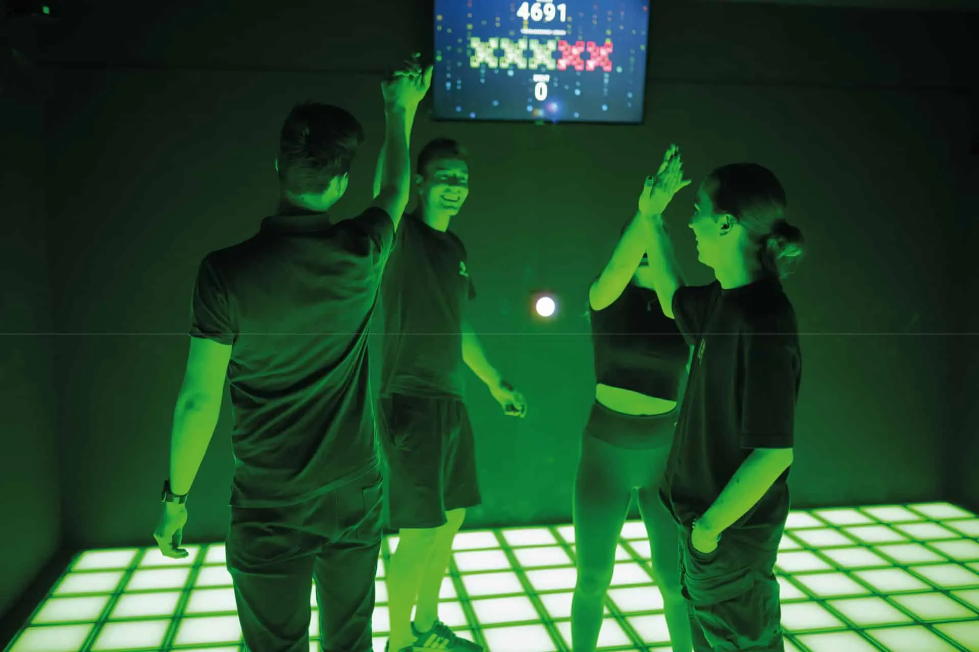 Floor is Lava se joue comme un jeu de plateforme grandeur nature sur notre sol interactif à dalles lumineuses. Franchissez les obstacles sans toucher la zone rouge (la « lave »). Ne manquez pas de coopérer avec votre équipe pour déjouer les défis et atteindre le haut du classement. Le jeu de réflexes et d’équilibre dont vous ne vous lasserez pas !